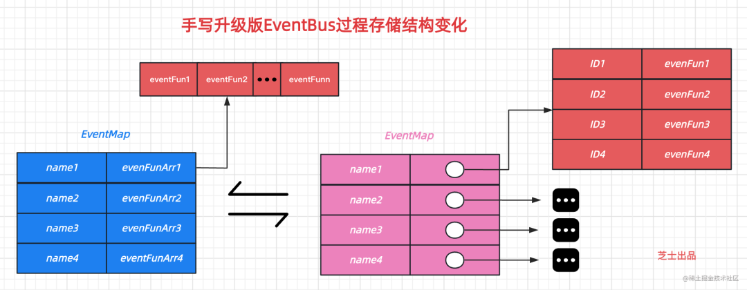 原有的存储结构不能满足取消订阅功能,原有结构 {key:value(value是数组结构)},需要变更为 {key:{id1:value1,id2:value2,id3:value3}} , 这样取消订阅可以根据每一个函数对应的 id 去取消 (因根据 id 取消,要保证 id 的唯一性),本文代码实现时,保证 id 唯一性,通过自增的方式实现,声明了一个 callbackId 。 这里的结构变化可能看一下原理图更清晰