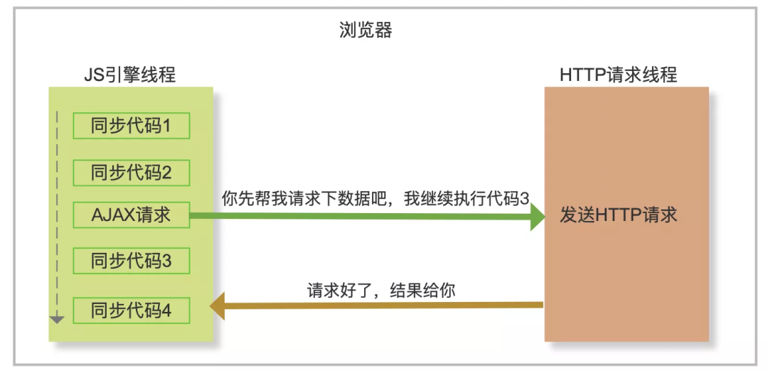 比如主线程中需要发一个 AJAX 请求,就把这个任务交给另一个浏览器线程(HTTP 请求线程)去真正发送请求,待请求回来了,再将 callback 里需要执行的 JS 回调交给 JS 引擎线程去执行。**即浏览器才是真正执行发送请求这个任务的角色,而 JS 只是负责执行最后的回调处理。**所以这里的异步不是 JS 自身实现的,其实是浏览器为其提供的能力。