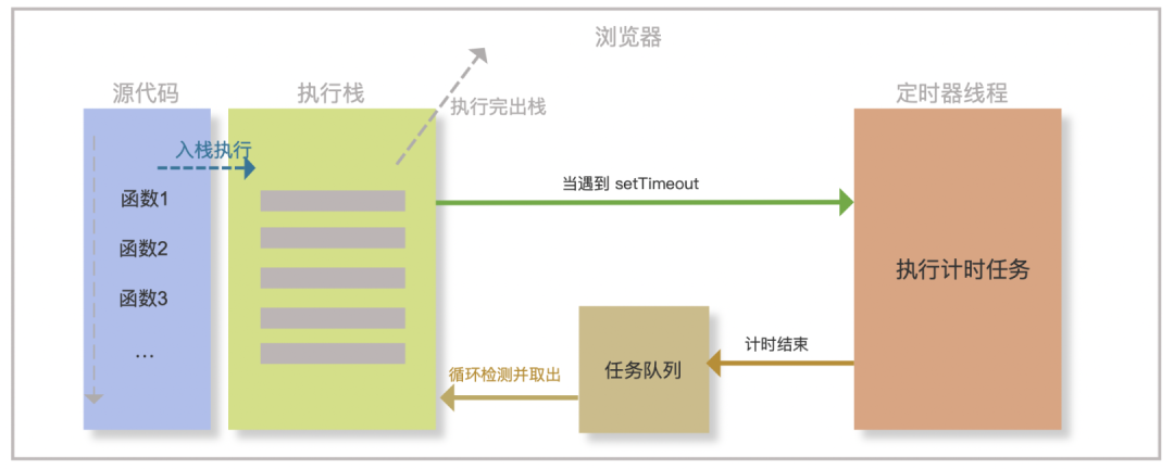 因为浏览器是多线程的,当 JS 需要执行异步任务时,浏览器会另外启动一个线程去执行该任务。也就是说,“JS 是单线程的” 指的是执行 JS 代码的线程只有一个,是浏览器提供的 JS 引擎线程(主线程)。浏览器中还有定时器线程和 HTTP 请求线程等,这些线程主要不是来跑 JS 代码的。
