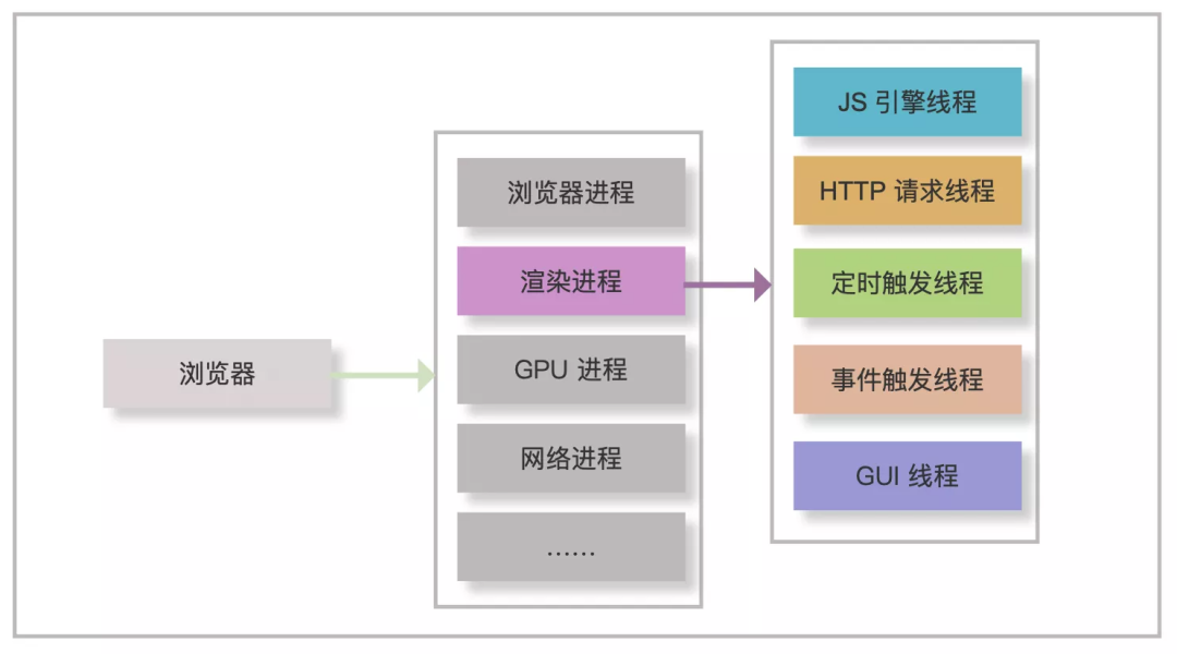 以 Chrome 为例,浏览器不仅有多个线程,还有多个进程,如渲染进程、GPU 进程和插件进程等。而每个 tab 标签页都是一个独立的渲染进程,所以一个 tab 异常崩溃后,其他 tab 基本不会被影响。作为前端开发者,主要重点关注其渲染进程,渲染进程下包含了 JS 引擎线程、HTTP 请求线程和定时器线程等,这些线程为 JS 在浏览器中完成异步任务提供了基础。