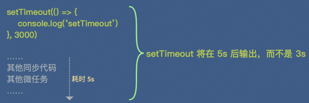 事件循环中,总是先执行同步代码后,才会去任务队列中取出异步回调来执行。当执行 setTimeout 时,浏览器启动新的线程去计时,计时结束后触发定时器事件将回调存入宏任务队列,等待 JS 主线程来取出执行。如果这时主线程还在执行同步任务的过程中,那么此时的宏任务就只有先挂起,这就造成了计时器不准确的问题。同步代码耗时越长,计时器的误差就越大。不仅同步代码,由于微任务会优先执行,所以微任务也会影响计时,假设同步代码中有一个死循环或者微任务中递归不断在启动其他微任务,那么宏任务里面的代码可能永远得不到执行。所以主线程代码的执行效率提升是一件很重要的事情。