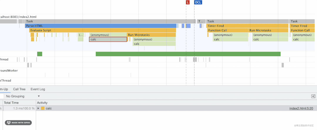 通过 Performance 工具可以看到代码执行的 Event Loop,包括宏微任务、执行时间等。