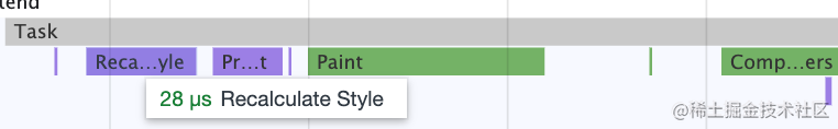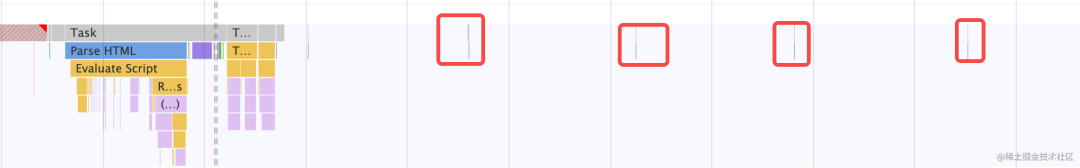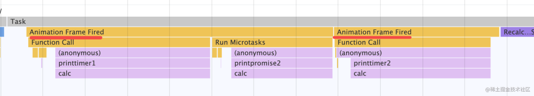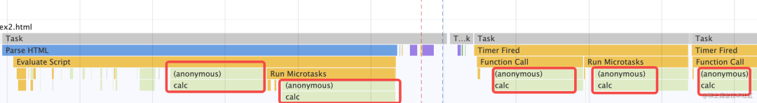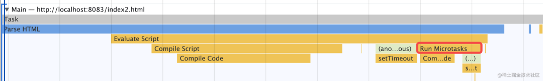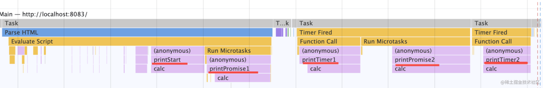 Promise.resolve().then(() => { console.log('promise1'); const timer2 = setTimeout(() => { console.log('timer2'); }, 0);});const timer1 = setTimeout(() => { console.log('timer1'); Promise.resolve().then(() => { console.log('promise2'); });}, 0);console.log('start');对照着 performance 分析出来的结果,就很容易理清宏微任务执行顺序了: