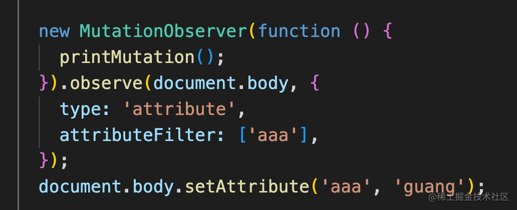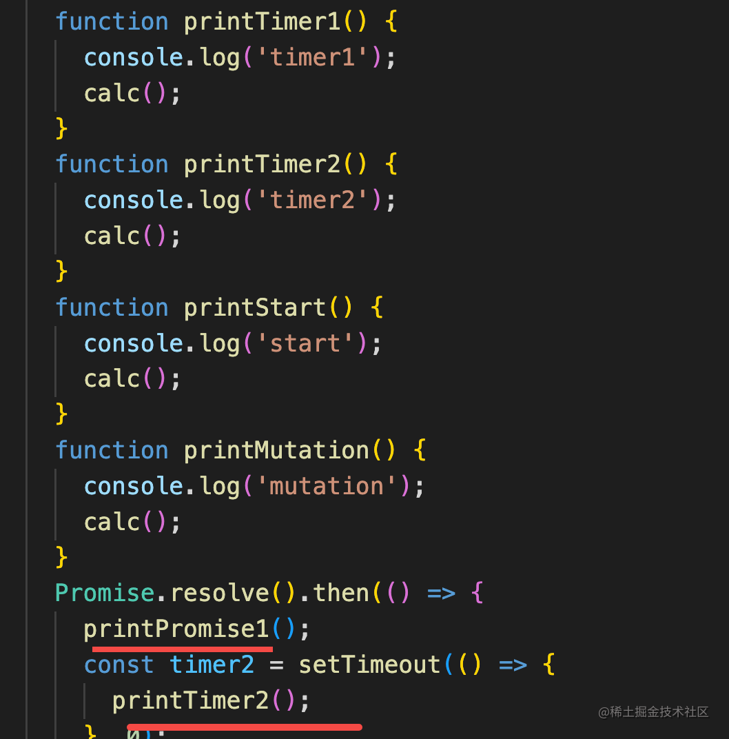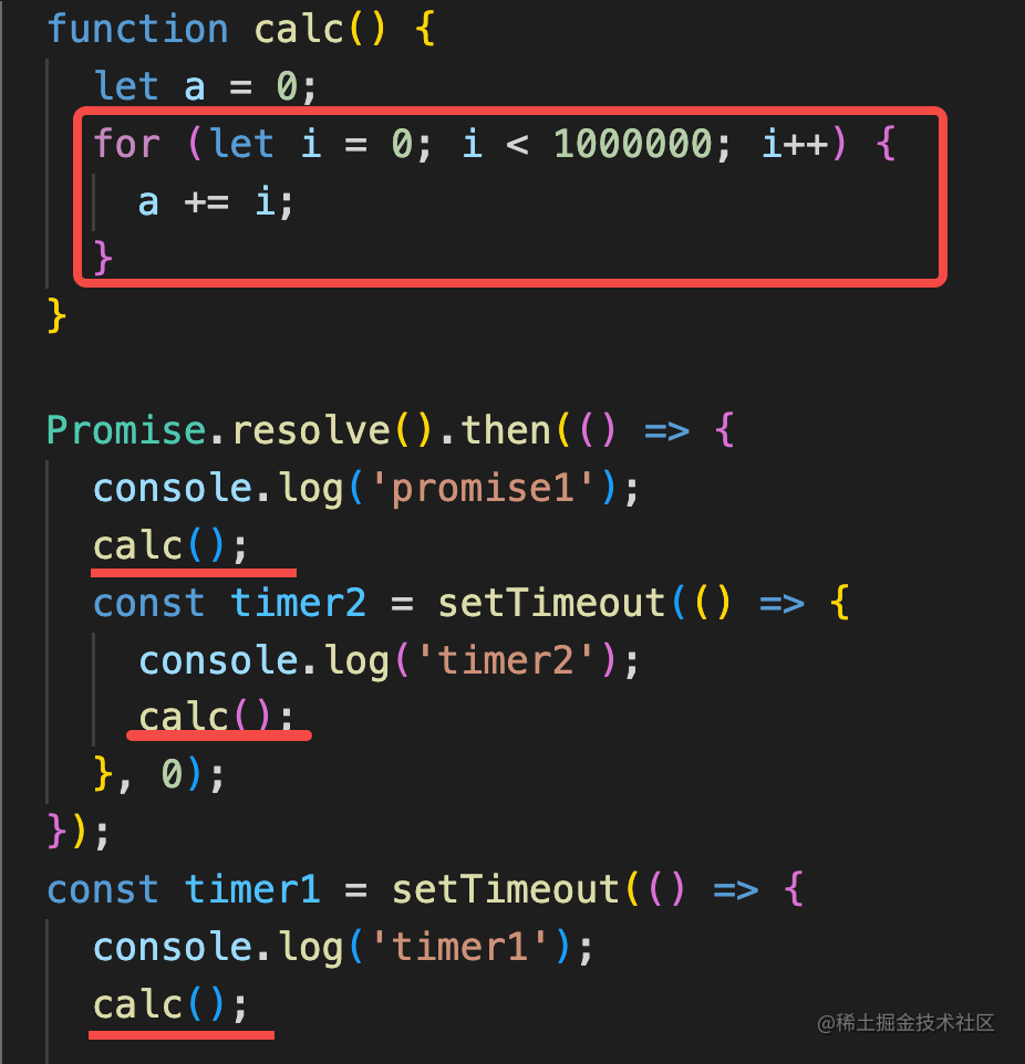 <!DOCTYPE html><html lang="en"> <body> <script> function calc() { let a = 0; for (let i = 0; i < 1000000; i++) { a += i; } } function printPromise1() { console.log('promise1'); calc(); } function printpromise2() { console.log('promise2'); calc(); } function printtimer1() { console.log('timer1'); calc(); } function printtimer2() { console.log('timer2'); calc(); } function printstart() { console.log('start'); calc(); } function printMutation() { console.log('mutation'); calc(); } Promise.resolve().then(() => { printPromise1(); const timer2 = setTimeout(() => { printtimer2(); }, 0); }); const timer1 = setTimeout(() => { printtimer1(); Promise.resolve().then(() => { printpromise2(); }); }, 0); new MutationObserver(function () { printMutation(); }).observe(document.body, { type: 'attribute', attributeFilter: ['aaa'], }); document.body.setAttribute('aaa', 'guang'); printstart(); </script> </body></html>总结