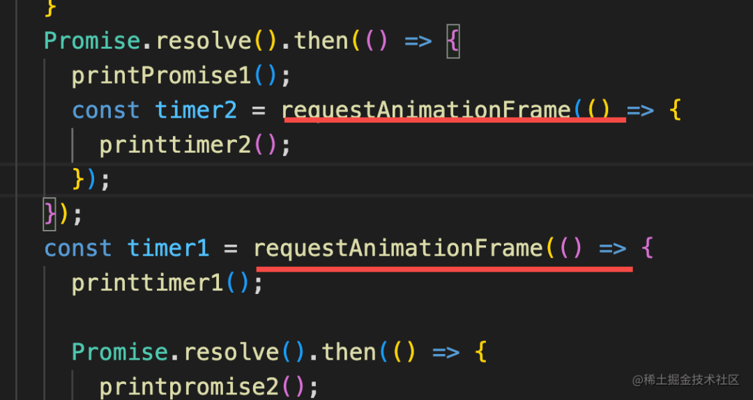 <!DOCTYPE html><html lang="en"> <body> <script> Promise.resolve().then(() => { console.log('promise1'); const timer2 = setTimeout(() => { console.log('timer2'); }, 0); }); const timer1 = setTimeout(() => { console.log('timer1'); Promise.resolve().then(() => { console.log('promise2'); }); }, 0); console.log('start'); </script> </body></html>很常见的 Promise、setTimeout 混合的代码。