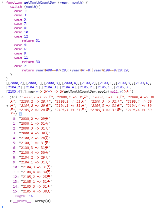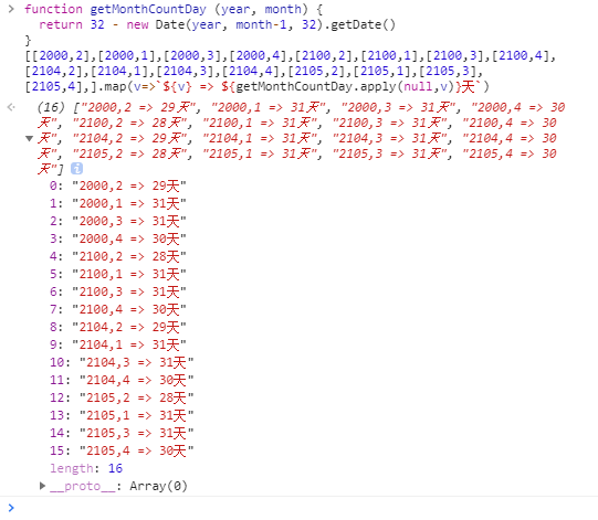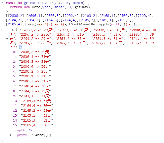 function getMonthCountDay(year, month){ // year 为年份,month 为月份}[[2000,2],[2000,1],[2000,3],[2000,4],[2100,2],[2100,1],[2100,3],[2100,4],[2104,2],[2104,1],[2104,3],[2104,4],[2105,2],[2105,1],[2105,3],[2105,4],].map(v=>`${v} => ${getMonthCountDay.apply(null,v)}天`)基础版本