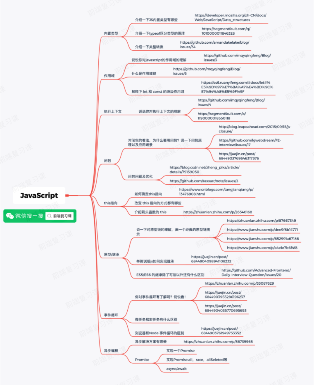 2020 年最后一个月了,熬夜多天整理出 17 张思维导图,对前端面试复习知识点进行了最全的总结,分享给大家。每个知识点都尽量找到最好的文章来解释,通过思维导图的形式进行展示。