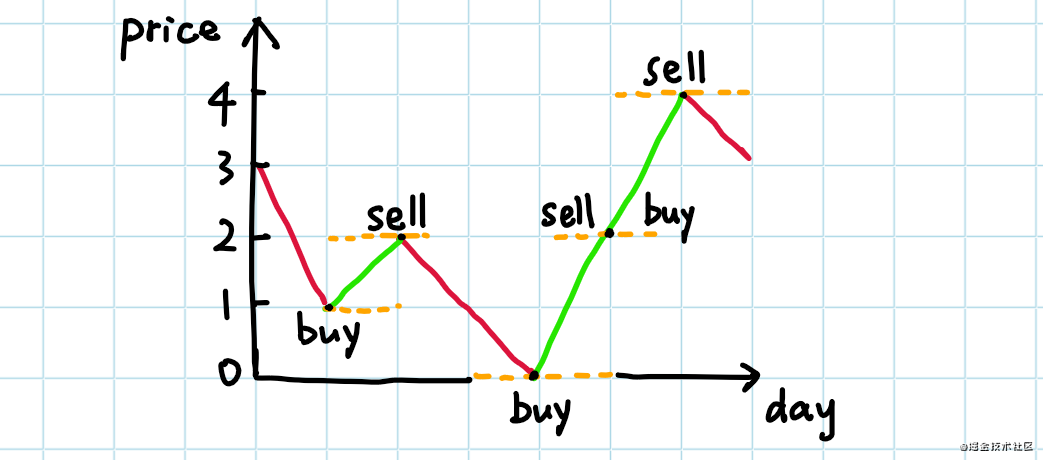 示例 1:输入: prices = [7,1,5,3,6,4]输出: 7解释: 在第 2 天(股票价格 = 1)的时候买入,在第 3 天(股票价格 = 5)的时候卖出, 这笔交易所能获得利润 = 5-1 = 4 。 随后,在第 4 天(股票价格 = 3)的时候买入,在第 5 天(股票价格 = 6)的时候卖出, 这笔交易所能获得利润 = 6-3 = 3 。示例 2:输入: prices = [1,2,3,4,5]输出: 4解释: 在第 1 天(股票价格 = 1)的时候买入,在第 5 天 (股票价格 = 5)的时候卖出, 这笔交易所能获得利润 = 5-1 = 4 。 注意你不能在第 1 天和第 2 天接连购买股票,之后再将它们卖出。因为这样属于同时参与了多笔交易,你必须在再次购买前出售掉之前的股票。示例 3:输入: prices = [7,6,4,3,1]输出: 0解释: 在这种情况下, 没有交易完成, 所以最大利润为 0。复制代码思路,看图马上思路就出来了:
