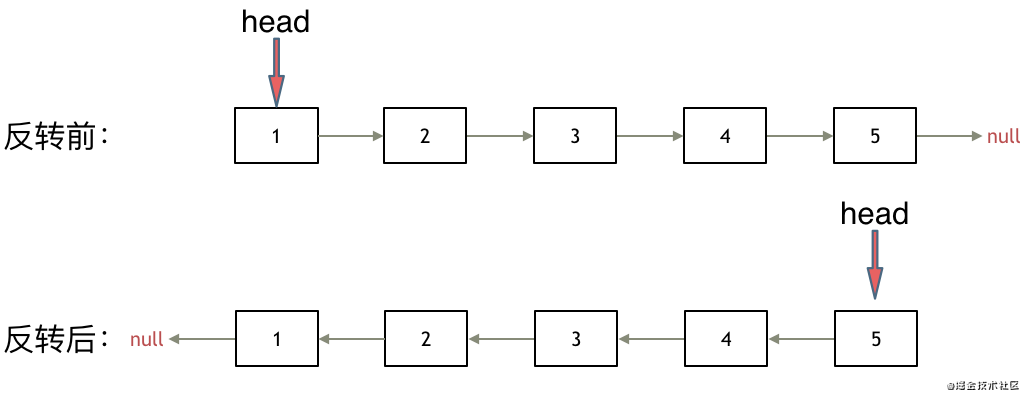 输入:head = [1,2]输出:[2,1]复制代码解题思路依然是看图找规律,下图就是,我们把链表前面加一个 null,这样翻转前和翻转后就一致了。 解答: