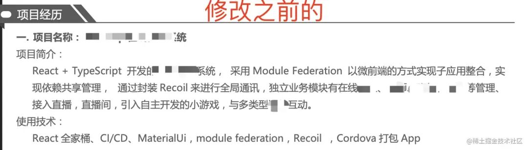 由于他之前的工作经历写了太多技术内容,所以他项目经验中就写不出其他内容了,这很不合理。