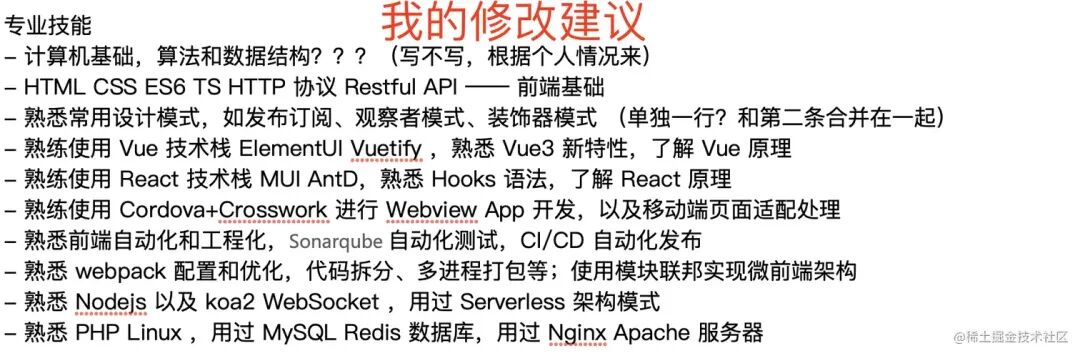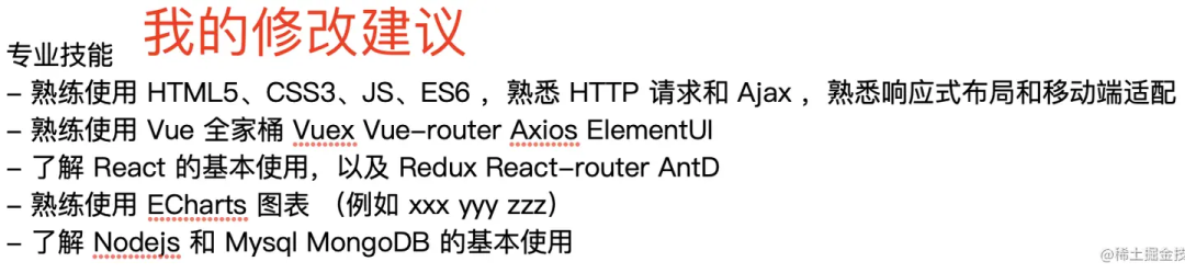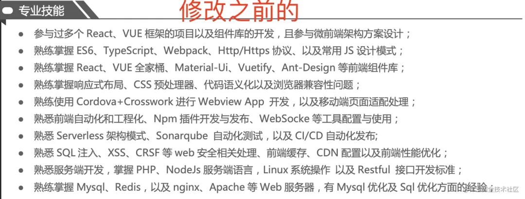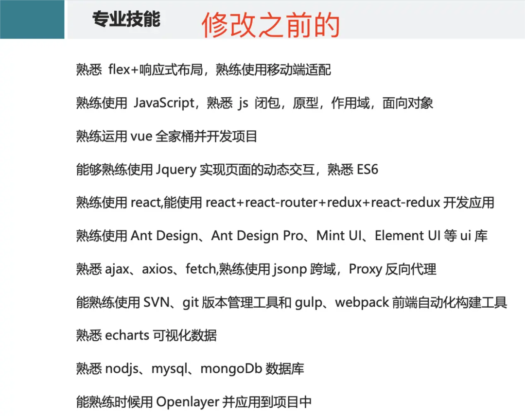 以上是他自己写的专业技能,很混乱,一看就没有经过整理归纳。例如 Vue React 写在一起;例如还有错误单词……