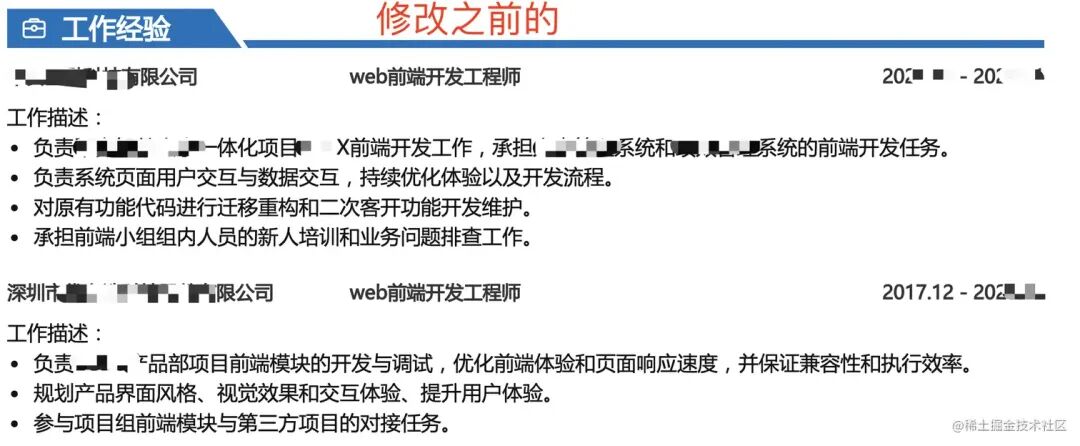 试问,你作为开发人员,在哪个项目不都是 “页面展现、路由搭建、组件封装、前后端交互,优化前端页面响应速度……” 这些工作吗,这有区别呢?写了等于没写,没任何价值。