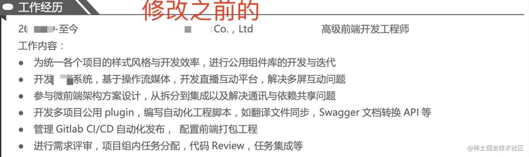 他写了三段工作经历,每个都是如此。主要问题是:这里写了太多技术相关的内容,后面的项目经验就没法再写了。