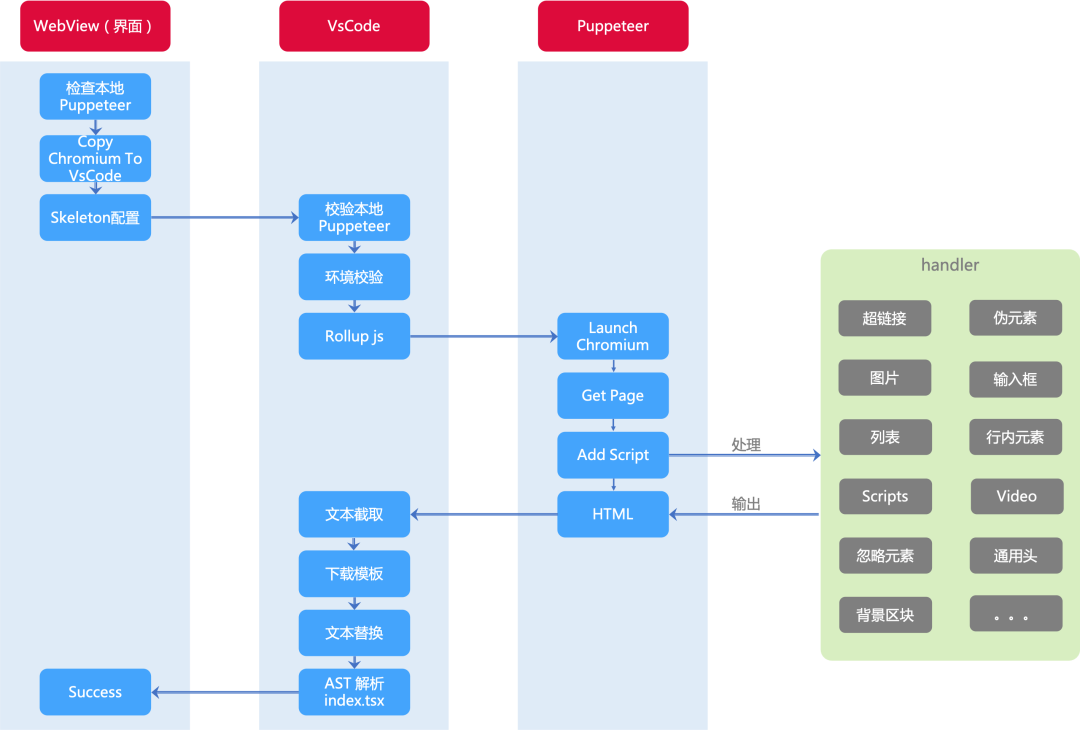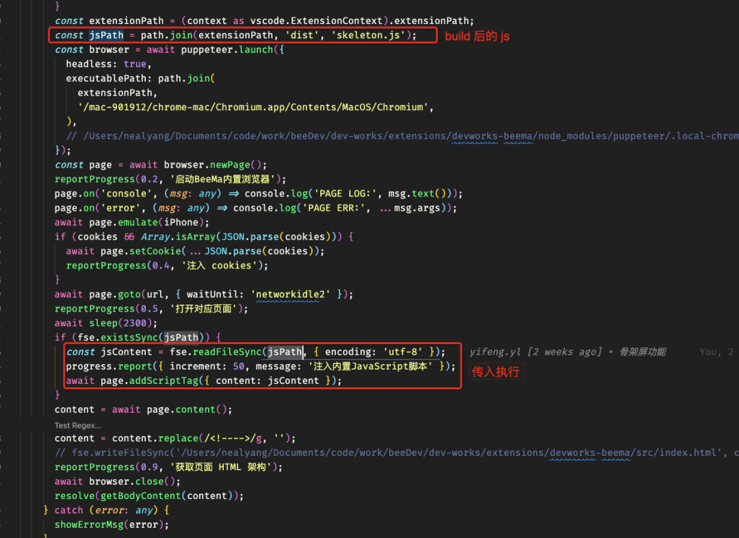 /** * 获取骨架屏 HTML 内容 * @param pageUrl 需要生成骨架屏的页面 url * @param cookies 登陆所需的 cookies * @param skeletonHeight 所需骨架屏最大高度(高度越大,生成的骨架屏 HTML 大小越大) * @param ignoreHeight 忽略元素的最大高度(高度低于此则从骨架屏中删除) * @param ignoreWidth 忽略元素的最大宽度(宽度低于此则从骨架屏中删除) * @param rootSelectId beema 架构中 renderID,默认为 root * @param context vscode Extension context * @param progress 进度实例 * @param totalProgress 总进度占比 * @returns */export const genSkeletonHtmlContent = ( pageUrl: string, cookies: string = '[]', skeletonHeight: number = 800, ignoreHeight: number = 10, ignoreWidth: number = 10, rootId: string = 'root', retainNav: boolean, retainGradient: boolean, context: vscode.ExtensionContext, progress: vscode.Progress<{ message?: string | undefined; increment?: number | undefined; }>, totalProgress: number = 30,): Promise<string> => { const reportProgress = (percent: number, message = '骨架屏 HTML 生成中') => { progress.report({ increment: percent * totalProgress, message }); }; return new Promise(async (resolve, reject) => { try { let content = ''; let url = pageUrl; if (skeletonHeight) { url = addParameterToURL(`skeletonHeight=${skeletonHeight}`, url); } if (ignoreHeight) { url = addParameterToURL(`ignoreHeight=${ignoreHeight}`, url); } if (ignoreWidth) { url = addParameterToURL(`ignoreWidth=${ignoreWidth}`, url); } if (rootId) { url = addParameterToURL(`rootId=${rootId}`, url); } if (isTrue(retainGradient)) { url = addParameterToURL(`retainGradient=${'true'}`, url); } if (isTrue(retainNav)) { url = addParameterToURL(`retainNav=${'true'}`, url); } const extensionPath = (context as vscode.ExtensionContext).extensionPath; const jsPath = path.join(extensionPath, 'dist', 'skeleton.js'); const browser = await puppeteer.launch({ headless: true, executablePath: path.join( extensionPath, '/mac-901912/chrome-mac/Chromium.app/Contents/MacOS/Chromium', ), // /Users/nealyang/Documents/code/work/beeDev/dev-works/extensions/devworks-beema/node_modules/puppeteer/.local-chromium/mac-901912/chrome-mac/Chromium.app/Contents/MacOS/Chromium }); const page = await browser.newPage(); reportProgress(0.2, '启动BeeMa内置浏览器'); page.on('console', (msg: any) => console.log('PAGE LOG:', msg.text())); page.on('error', (msg: any) => console.log('PAGE ERR:', ...msg.args)); await page.emulate(iPhone); if (cookies && Array.isArray(JSON.parse(cookies))) { await page.setCookie(...JSON.parse(cookies)); reportProgress(0.4, '注入 cookies'); } await page.goto(url, { waitUntil: 'networkidle2' }); reportProgress(0.5, '打开对应页面'); await sleep(2300); if (fse.existsSync(jsPath)) { const jsContent = fse.readFileSync(jsPath, { encoding: 'utf-8' }); progress.report({ increment: 50, message: '注入内置JavaScript脚本' }); await page.addScriptTag({ content: jsContent }); } content = await page.content(); content = content.replace(/<!---->/g, ''); // fse.writeFileSync('/Users/nealyang/Documents/code/work/beeDev/dev-works/extensions/devworks-beema/src/index.html', content, { encoding: 'utf-8' }) reportProgress(0.9, '获取页面 HTML 架构'); await browser.close(); resolve(getBodyContent(content)); } catch (error: any) { showErrorMsg(error); } });};❝