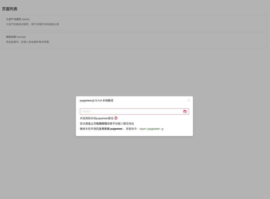 全局安装后,插件会自动查找本地的 puppeteer 路径,如果找到插件,则进行 copy 到插件内的过程,否则需要用户自己手动填写路径puppeteer地址。(一旦查找成功后,后续则无需填写地址,全局 puppeteer 包也可删除)