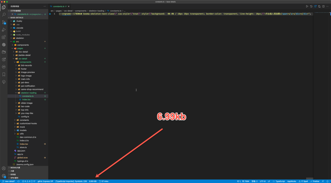 const SKELETON_SCSS = `// beema skeleton.beema-skeleton-text-class { background-color: transparent !important; color: transparent !important; background-image: linear-gradient(transparent 20%, #e2e2e280 20%, #e2e2e280 80%, transparent 0%) !important;}.beema-skeleton-pseudo::before,.beema-skeleton-pseudo::after { background: #f7f7f7 !important; background-image: none !important; color: transparent !important; border-color: transparent !important; border-radius: 0 !important;}`;/** * * @param proPath 项目路径 */export const addSkeletonSCSS = (proPath: string) => { const globalScssPath = path.join(proPath, 'src', 'global.scss'); if (fse.existsSync(globalScssPath)) { let fileContent = fse.readFileSync(globalScssPath, { encoding: 'utf-8' }); if (fileContent.indexOf('beema-skeleton') === -1) { // 本地没有骨架屏的样式 fileContent += SKELETON_SCSS; fse.writeFileSync(globalScssPath, fileContent, { encoding: 'utf-8' }); } }};如果 global.scss 中没有相应骨架屏的样式 class,则自动注入进去