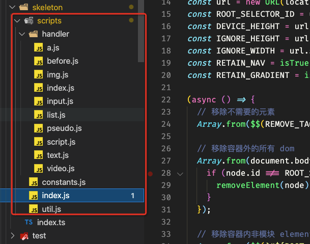 // 移除不需要的元素 Array.from($$(REMOVE_TAGS.join(','))).forEach((ele) => removeElement(ele)); // 移除容器外的所有 dom Array.from(document.body.childNodes).map((node) => { if (node.id !== ROOT_SELECTOR_ID) { removeElement(node); } }); // 移除容器内非模块 element Array.from($$(`#${ROOT_SELECTOR_ID} .contentWrap`)).map((node) => { Array.from(node.childNodes).map((comp) => { if (comp.classList && Array.from(comp.classList).includes('compContainer')) { // 模块设置白色背景色 comp.style.setProperty('background', '#fff', 'important'); } else if ( comp.classList && Array.from(comp.classList).includes('headContainer') && RETAIN_NAV ) { console.log('保留通用头'); } else if ( comp.classList && Array.from(comp.classList).join().includes('gradient-bg') && RETAIN_GRADIENT ) { console.log('保留了渐变背景色'); } else { removeElement(comp); } }); }); // 移除屏幕外的node let totalHeight = 0; Array.from($$(`#${ROOT_SELECTOR_ID} .compContainer`)).map((node) => { const { height } = getComputedStyle(node); console.log(totalHeight); if (totalHeight > DEVICE_HEIGHT) { // DEVICE_HEIGHT 高度以后的node全部删除 console.log(totalHeight); removeElement(node); } totalHeight += parseFloat(height); }); // 移除 ignore 元素 Array.from($$(`.${IGNORE_CLASS_NAME}`)).map(removeElement);❝