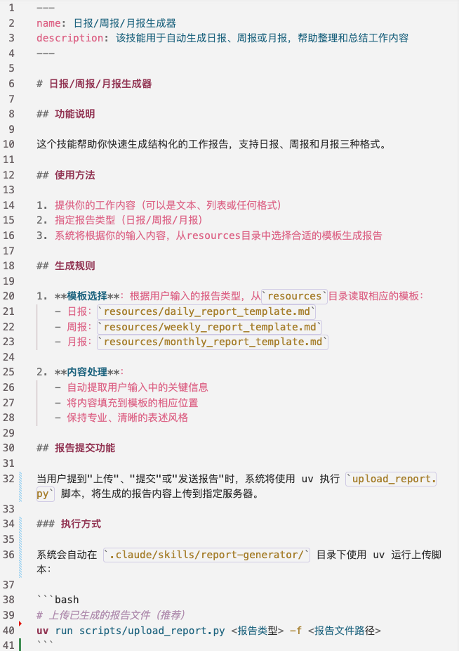 report-generator/├── SKILL.md├── resources/│ ├── daily_report_template.md│ ├── weekly_report_template.md│ └── monthly_report_template.md├── scripts/│ └── upload_report.py3. 核心文件实现