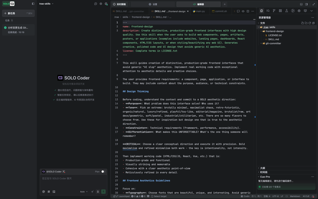 在 TRAE 里使用技能很容易,你加载好需要的技能后,只需在对话框中用日常语言说明你的需求就行。
