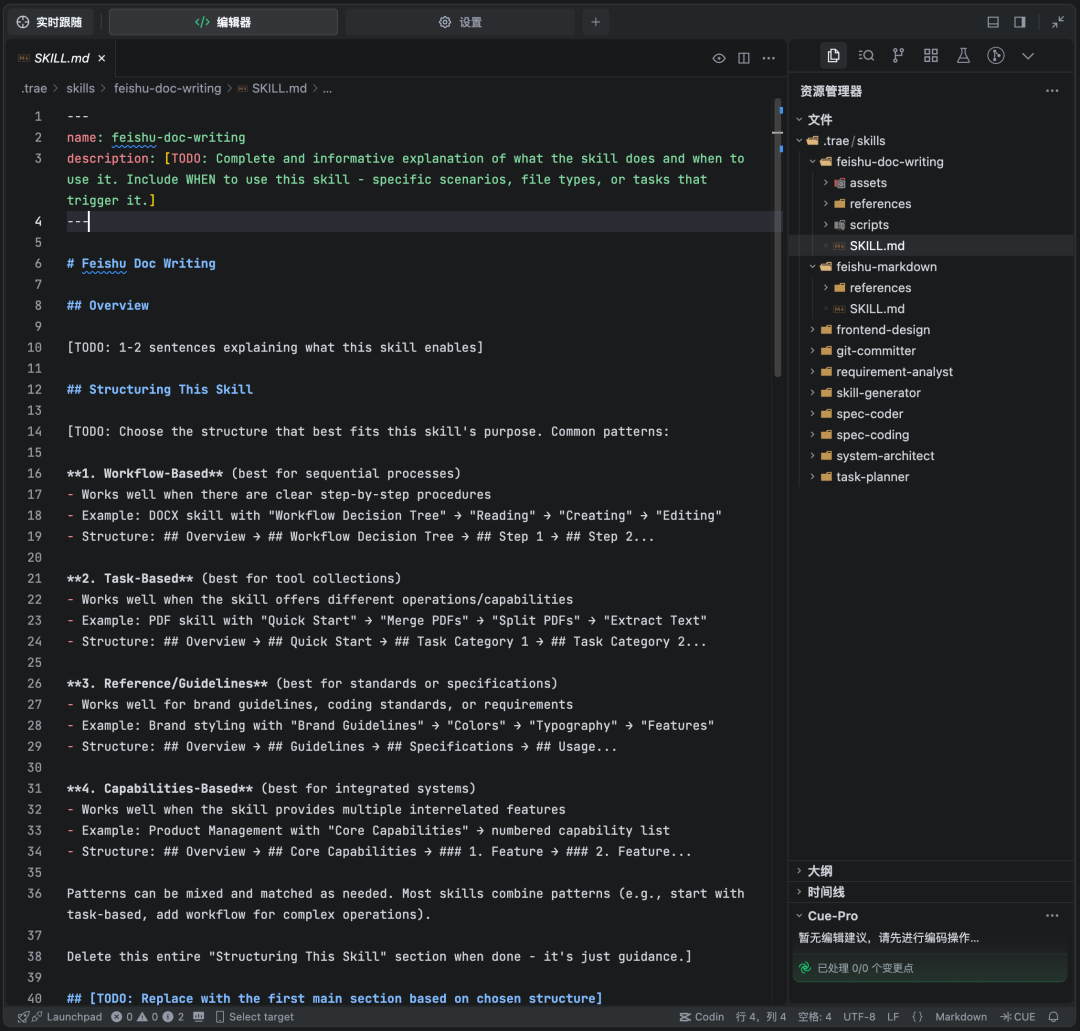 上面提到将开发过程划分为四个关键阶段,所以要完成 “需求分析、技术设计、任务拆解” 的飞书文档撰写,还有最终的代码实现。为此,我们需要不同的技能来满足不同场景下的文档编写需求,并且要教会 Agent 如何使用飞书工具进行创作协同。