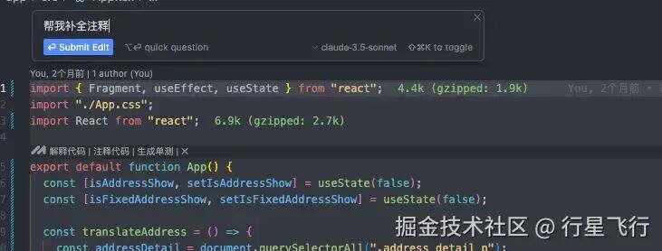 一般操作是直接选中部分代码后通过 command + K 唤醒,适合小范围代码提问优化或者修改,比如我全选了一个组件,让它帮我补全关键注释或者帮我编写 readme 文档,对于不爱写注释和文档的同学简直是福音。