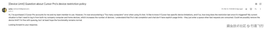 但 cursor 有多设备检测,如果多设备高频使用 chat 会导致聊天出现报错并进入冷却期,不过 tab 补全并不会受影响。