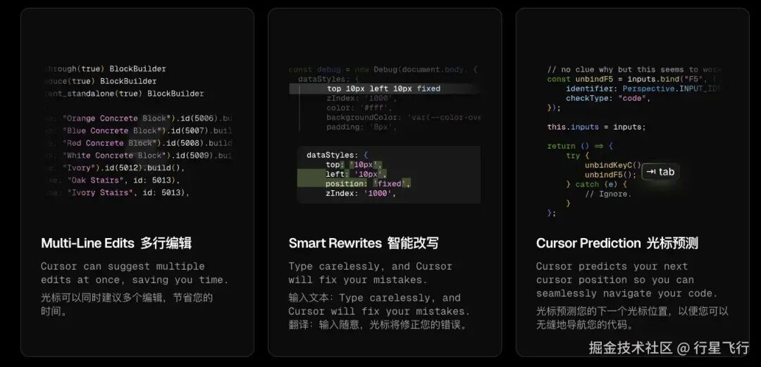 cursor 会根据用户行为预测代码补全,除了早期 copilot 写注释以及理解上下文的代码补全,cursor 支持用户任意修改智能预测以及修正代码格式错误,比如大括号闭合缺失修正;以及多行代码批量预测(一次 tab 自定修改多行),光标预测(cursor 会在预测你下次修改的地方出现 tab 图标)。
