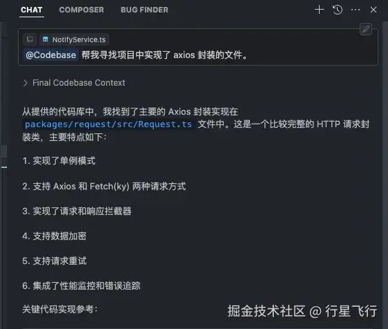 5:在输入问题后,cursor 支持两种提问,如果直接 enter cursor 会基于 AI 检索信息以及你的上下文进行回答,但有时候我们只想聊聊项目的问题,比如 base utils 有封装 axios ,后续有元改了包的结构和内容,我想知道现在这个文件在哪,很显然互联网信息帮助不了我们,我可以直接描述问题后 command + enter,此时就是基于项目代码来提问,这对于项目找代码或者理解项目非常有帮助。