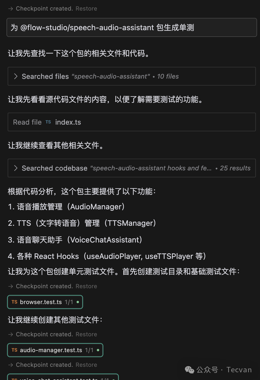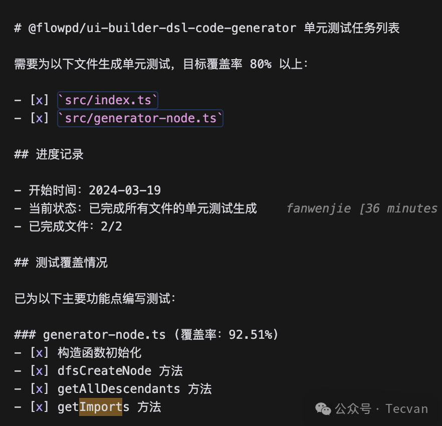 # InstructionsWhen a user requests to generate unit tests for a directory of packages, first check the task progress in the `.cursor/unit-test` directory and prioritize resuming the previous progress. If no previous progress is recorded, start a new task and execute:1. Find the code location corresponding to the package name;2. Locate the source files containing logic code in the directory, record them as a task list, and save to `.cursor/unit-test/tasks.md`, for example:- [ ] `src/index.ts`- [ ] `src/utils/index.ts`- [ ] `src/hooks/index.ts`- [ ] `src/components/index.ts`- [ ] `src/pages/index.ts`- [ ] `src/services/index.ts`- [ ] `src/types/index.ts`3. Following the instructions in `./.cursor/spec-for-ut.md`, generate unit tests for each file from the previous step. After generation and passing tests, record in `.cursor/unit-test/tasks.md`, for example:- [x] `src/index.ts`- [x] `src/utils/index.ts`- [x] `src/hooks/index.ts`- [x] `src/components/index.ts`- [x] `src/pages/index.ts`- [x] `src/services/index.ts`- [x] `src/types/index.ts`4. If some unit test files consistently fail and only have one or two failing test cases, remove those test cases to ensure overall test passing5. If any error cases are encountered during generation, record them in `.cursor/lessons` to avoid repeating the same mistakes in the future;6. Recursively generate unit tests for each file until all files are completed, then exit the execution process7. after all the files are completed, you should update the `.cursor/unit-test/tasks.md` file to reflect the progress.# Limitations- you can just use vitest to generate the unit test code.之后,Cursor 每次生成单测时都会先到 tasks.md 文件中查找任务列表,恢复上次执行进度。
