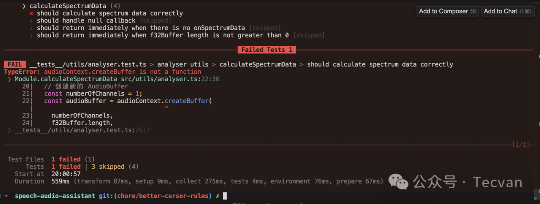 为 @coze/api 包生成单测//or 为 xxx 目录/文件生成单测至此,至少从 “量” 上,Cursor 已经能帮助生成比较完整的单测代码了,并且大部分简单代码都能一次性通过。但对于复杂场景、复杂组件,生成的代码通常会存在一些问题,没法直接跑通,例如: