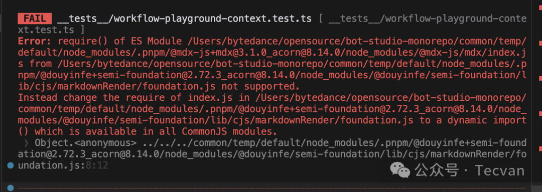 Mock上面,例如下图所示,错误看起来是 ESM 与 CommonJS 互相调用的问题,实则可以通过 Mock 解决,因此需要有意识 Mock 掉所有下游模块调用、环境变量调用等 (LLM 在这方面做的并不是很好,还是需要比较多人工介入);