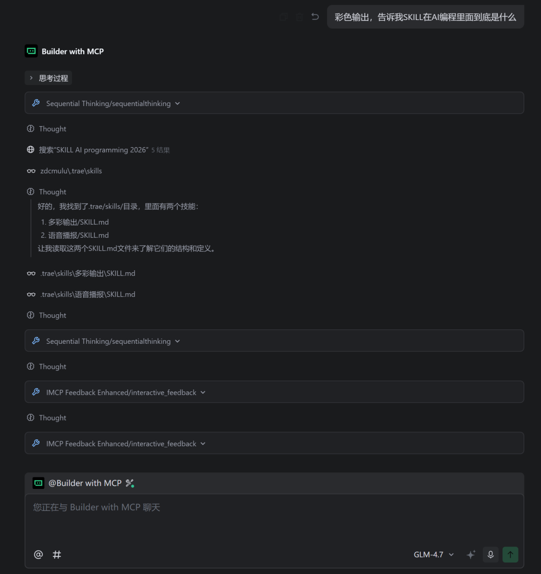该技能主要是为了能够让 AI 在回复的时候,根据内容情况,修改内容的颜色,便于我们直接就看到关键点等,功能比较简单,先让大家感受一下 Skill 的魅力。