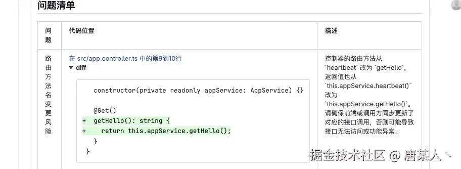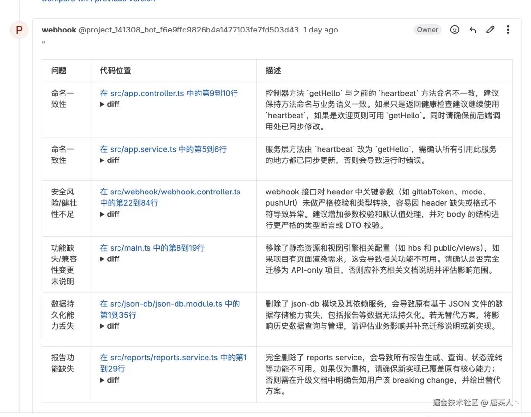 还一种是报告的展示形式。它会在提交的 MR 下输出一个评审报告,列出所有问题的标题、所在位置、以及具体原因。但是,这两种模式实现的本质都一样,只不过是展示结果的方式有不同,这个看你个人喜欢。