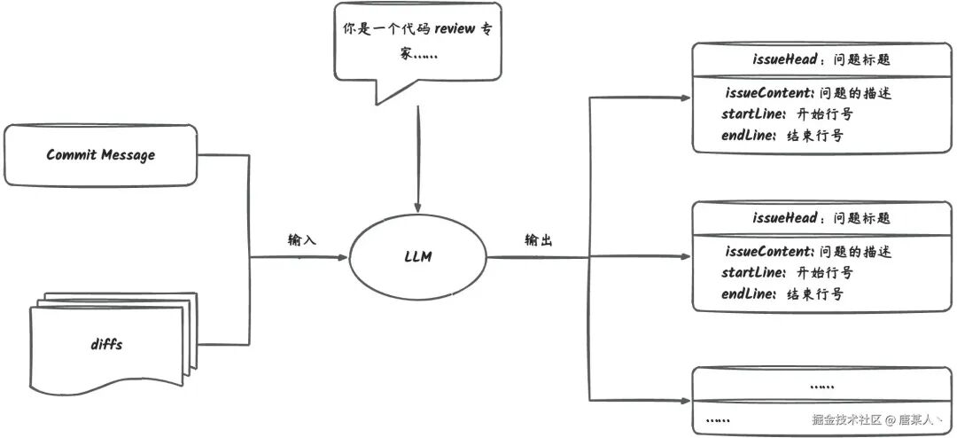 首先我们先思考一下编写提示词的目的是什么?我们期望的是,通过提示词指引 LLM,当输入 diff 文本的时候,它能够分析里面的代码并输出结构化的数据。