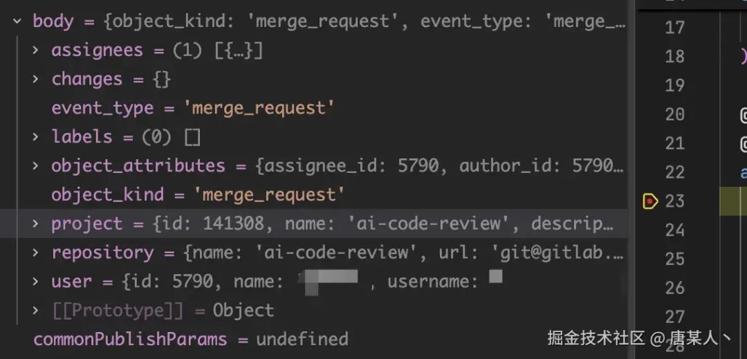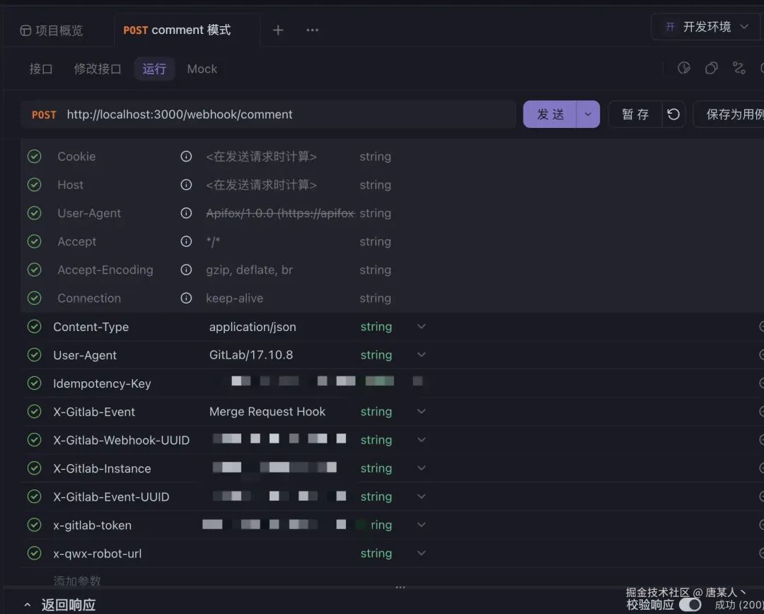 body 中会包含很多有用的的信息,如 Git 仓库信息、分支信息、MR 信息、提交者信息等,这些数据是 GitLab 调用 webhook 接口时发送过来的,在后续的逻辑中,都会用到里面的数据。