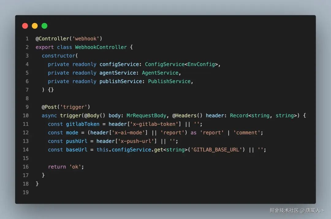 所以,我们要做的第一件事,就是定义一个接口 url,用于接收 GitLab 的 webhook 事件。下面的代码中,实现了一个处理/webhook/trigger路由的 controller,它的主要职责是接收 MR 事件并且解析 body 和 header 中的参数,代码如下(完整代码)