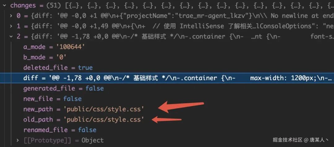 调用成功以后,获取的数据如下,changes 中会包含每个文件的 diff