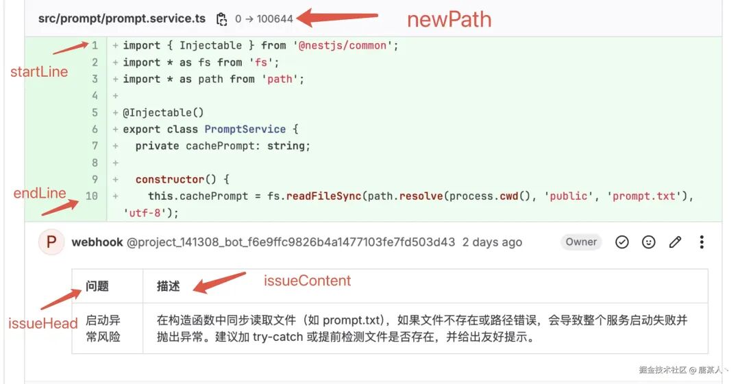 从上面方法的入参可以看到,newPath、oldPath、endLine、issuceContent 等数据,都是在通过 LLM 分析以后得出来的。