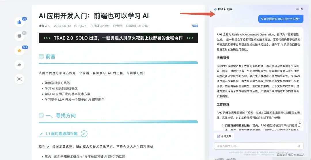 如果看到文章中有任何不懂的,我建议你都可以直接问 AI。我看掘金自带的这个 AI 助手也挺方便的。我们既然要学习 AI,就要多用 AI 的方式去学习。当然,你也可以直接留言问我。
