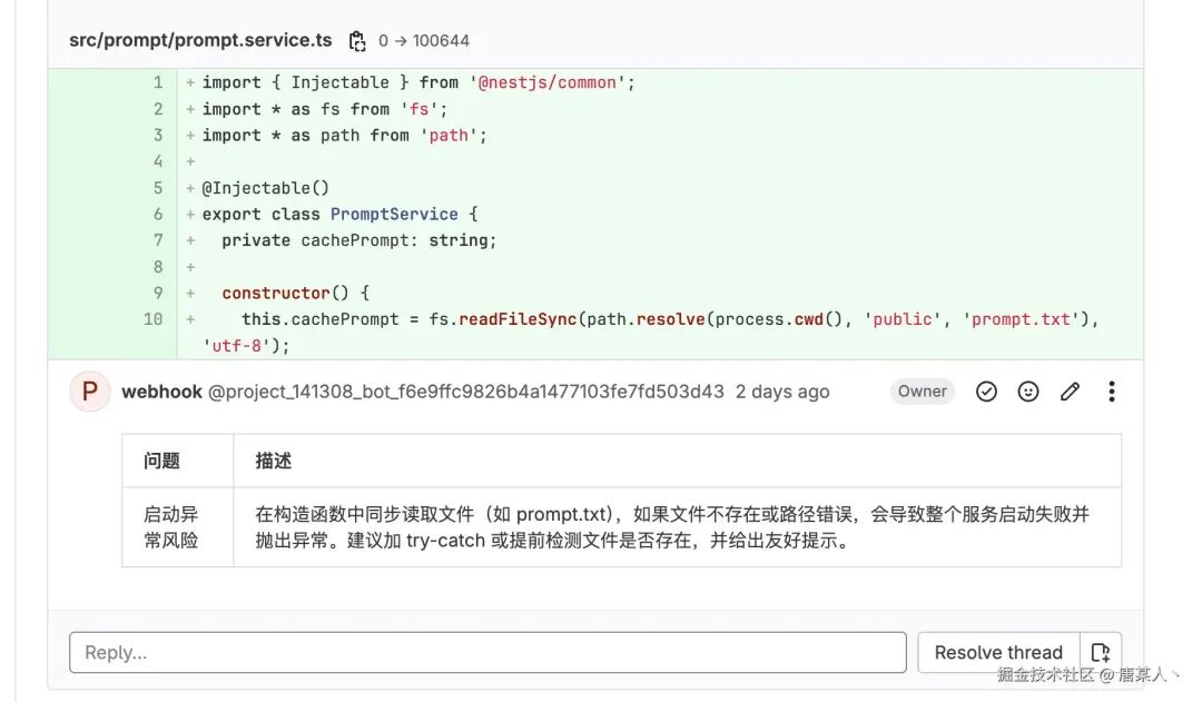 通过 AI 分析提交的代码,然后会在有问题的代码下,评论出问题类型以及问题的具体原因。