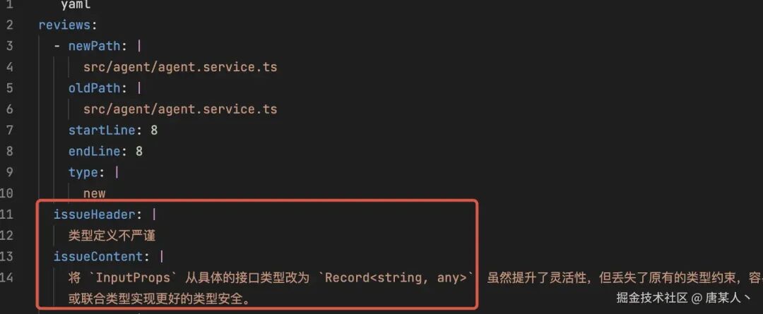 我们知道 yaml 的字段结构是按空格来控制的,但有时候 LLM 偏偏就在某些字段前面少一个或者多个空格,排查的时候也是非常的头痛,例如下面的 issueHeader、issueContent 因为少了空格,而导致 yaml 解析异常…