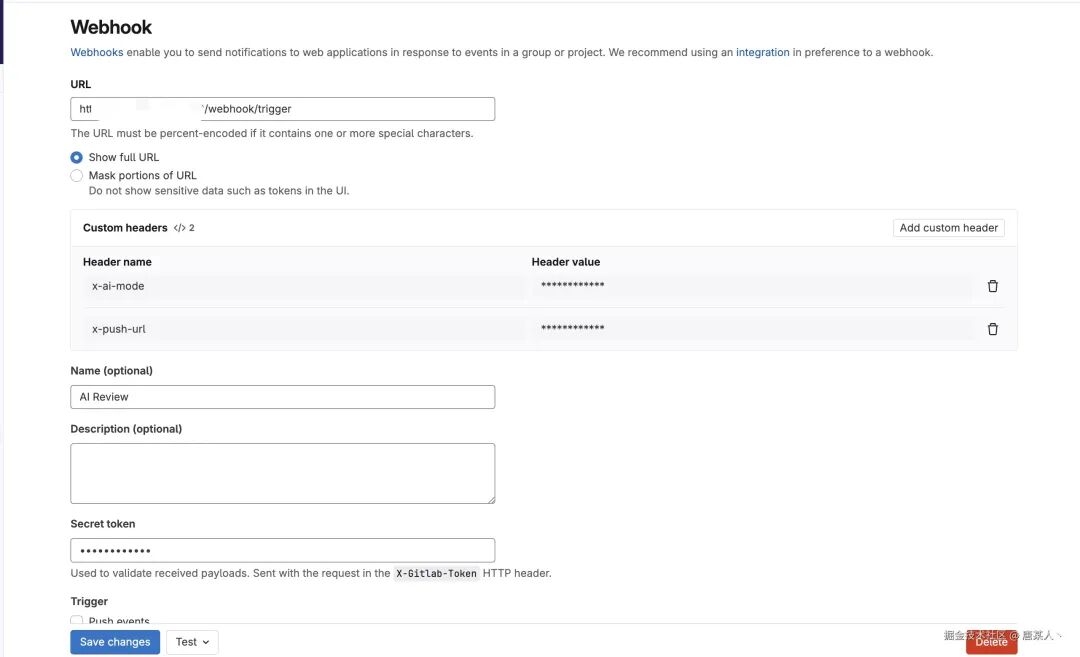 以 GitLab 为例,它会允许开发者在每个项目中配置多个 webhook 接口。比如,咱们配置一个 http://example.com/webhook/trigger 的地址。当发生相关 git 事件时,GitLab 就会往这个地址推送消息。