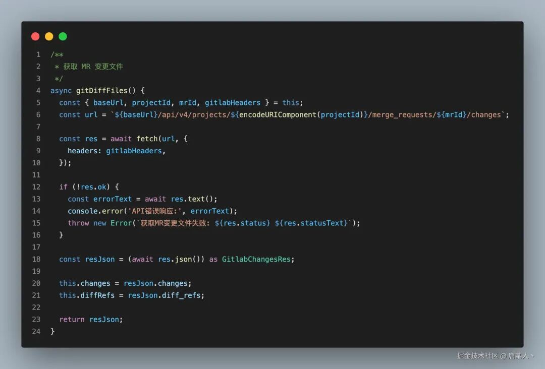 在能够接受到 GitLab 发送的 MR 事件后,就要解决如何获取 diff 的问题。这一步很简单, 调用 GitLab 官方的 API 就可以。重点就是两个核心逻辑: