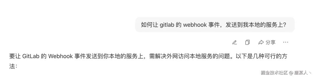 调试开发的这个接口确实是一个比较麻烦的问题。因为 GitLab 基本都是内网部署,想要真实调试接口,一是需要真实代码仓库,二是需要想办法把 GitLab 的请求转发到本地来。这里我给大家分享三个办法: