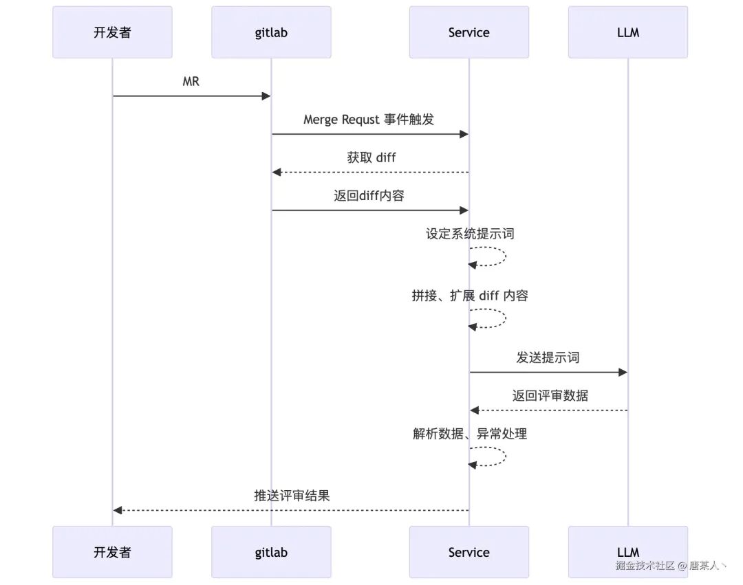 这次搭建的 AI Code Review 应用,本质上是一个 NodeJS 服务。这个服务通过感知 MR 事件,获取 diff 交给 LLM 分析,得到结论以后,会输出评论到 GitLab。整体流程图如下:
