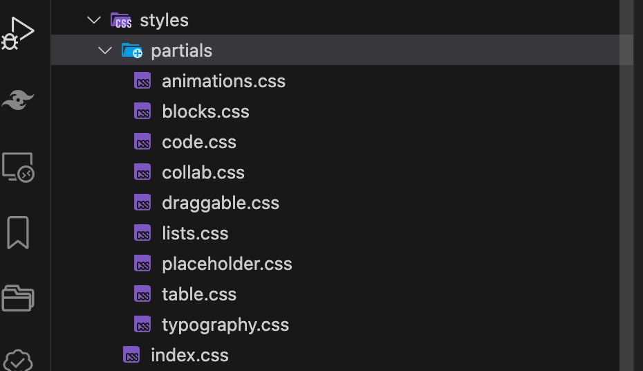 └── middleware.ts # Next.js 中间件,用于请求拦截、认证控制等其中 styles 里面包含了大量的 tiptap 的 css 样式,这些 CSS 文件用于为 Tiptap 提供完整的富文本样式支持。由于 Tiptap 是无头组件,所有样式(如段落、代码块、表格、列表、协同编辑等)都需自行定义。每个 CSS 文件针对一个功能模块进行样式分离,便于维护与扩展。这种拆分方式能保持样式结构清晰、职责明确。