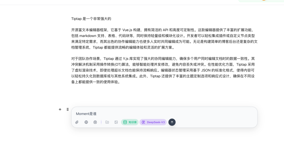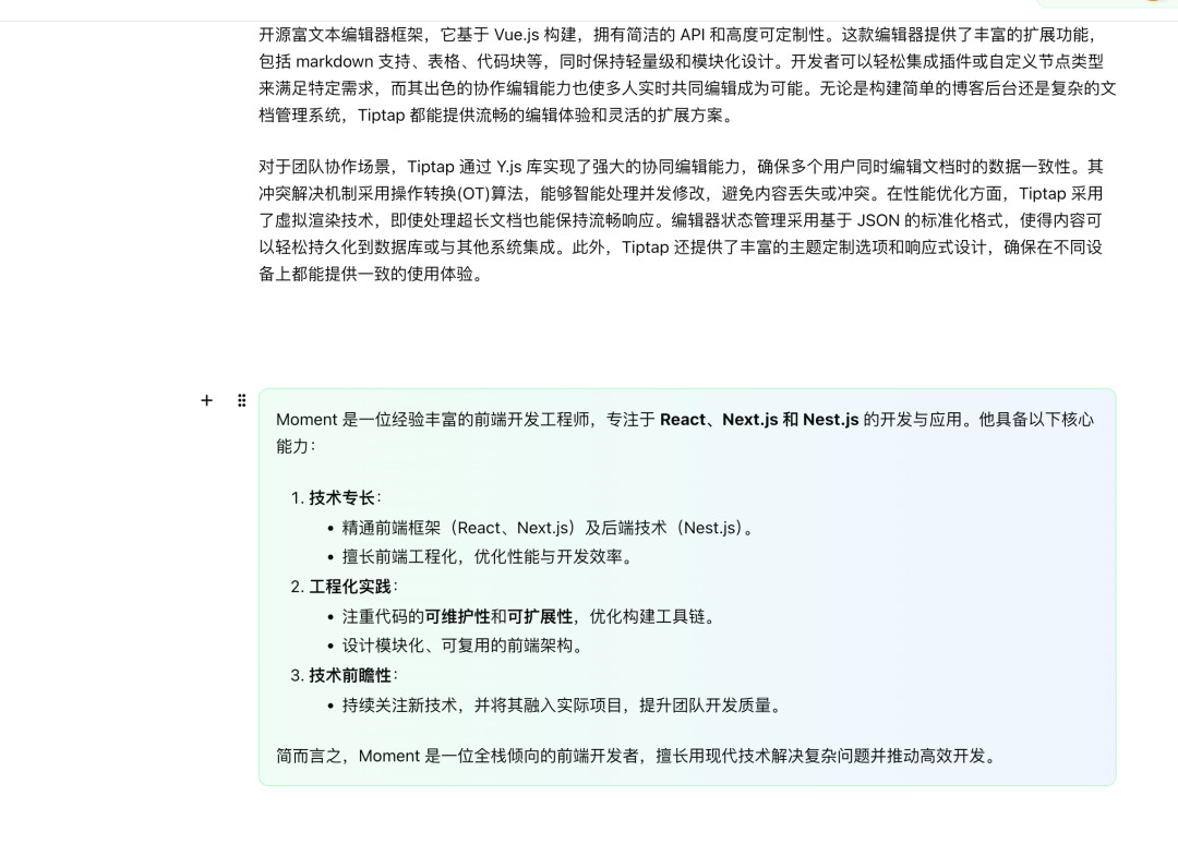 当 AI 技术刚刚兴起时,我加入了一家 AI 初创公司。由于我们在项目中有着对高级编辑功能的需求,我第一次接触到了 Tiptap。让我印象深刻的是,Tiptap 与其他编辑器相比,最大亮点在于它的灵活性和可扩展性。这种高度的定制能力,让我们能够根据需求随时调整和扩展编辑器的功能,完全满足了我们的独特要求。