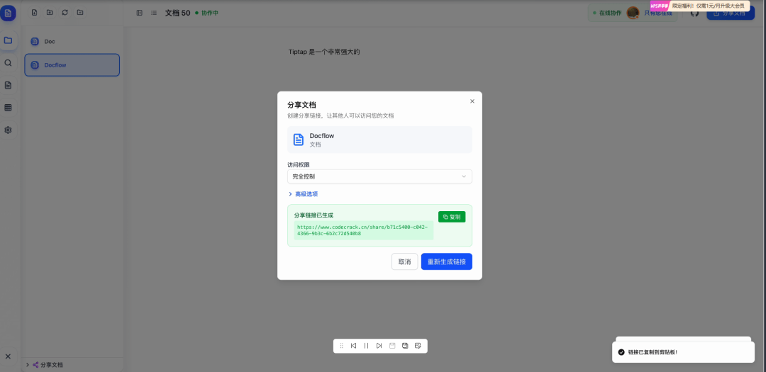 协同编辑我们可以再文档这里点击文件进行分享,并且可以设置文件的权限以及是否需要密码等: