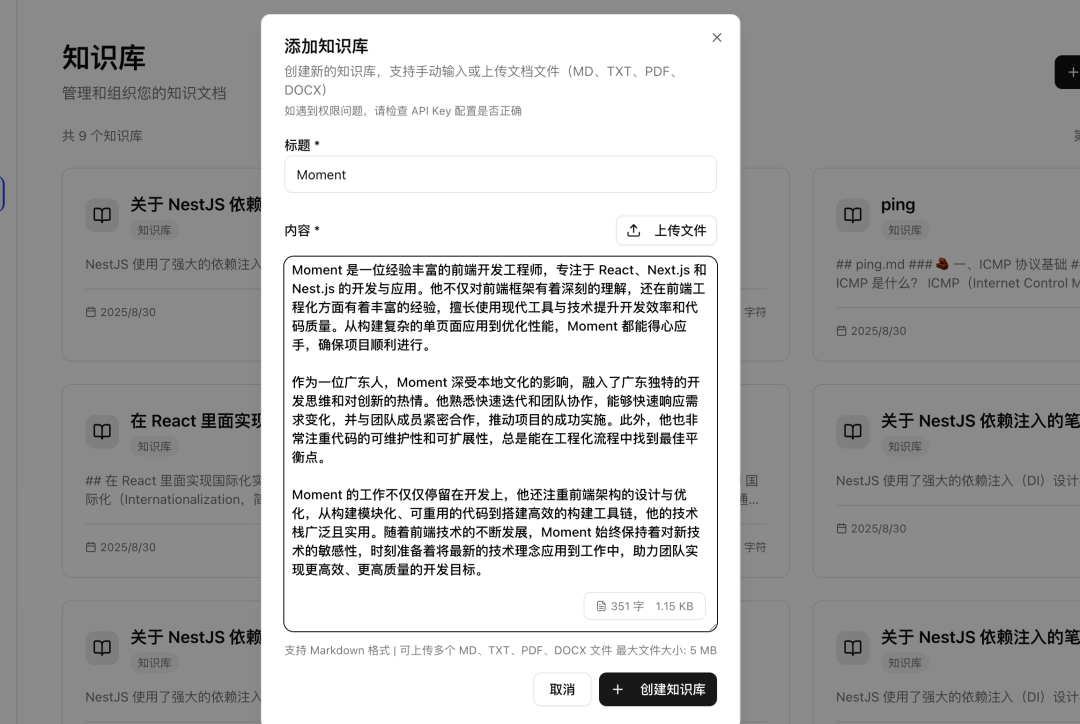 上面的是续写的,接下来展示 AI 问答的,首先我们可以上传我们自己的一些内容: