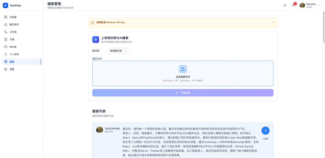 AI 播客处理流程是用户上传简历和选择相对应的面试官,但是最好是相同简历对应面试官类型,不然可能生成出来的内容乱七八糟的: